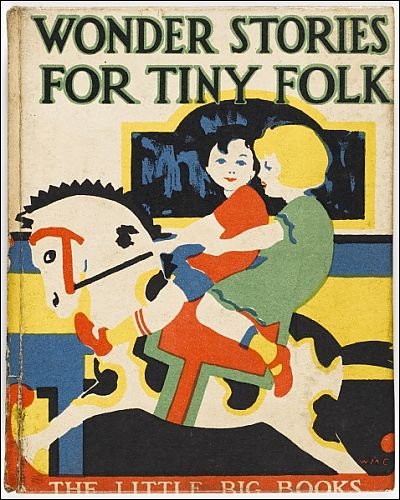 10x8 Print, Wonder Stories for Tiny Folk. Bold, art deco style front cover illustration to a childrens book showing two small children enjoying a ride on a rocking horse. Chosen by Mary Evans. High quality RA4 prints. Printed on Kodak Endura and Edge papers..../ Photographic Prints of Wonder Stories for Tiny Folk from Mary Evans / rocking horse